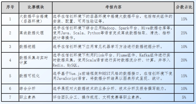 - 考核內(nèi)容包括在容器環(huán)境中搭建大數(shù)據(jù)平臺、進(jìn)行離線數(shù)據(jù)處理、數(shù)據(jù)挖掘、數(shù)據(jù)采集與實(shí)時計(jì)算、數(shù)據(jù)可視化以及綜合分析,旨在評估參賽者在信創(chuàng)技術(shù)環(huán)境下的綜合應(yīng)用能力。